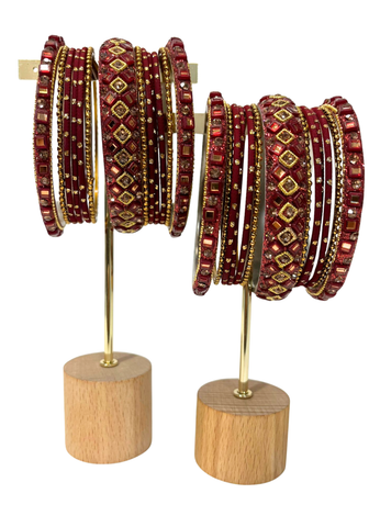 Sublimez vos poignets avec le lot Bracelets Heera bordeaux composé de deux ensembles assortis pour les deux mains. Un mélange harmonieux de bangles fins, strass, miroirs et détails dorés pour un effet chic, lumineux et festif. Parfait pour accompagner un sari, un lehenga ou une tenue de cérémonie.