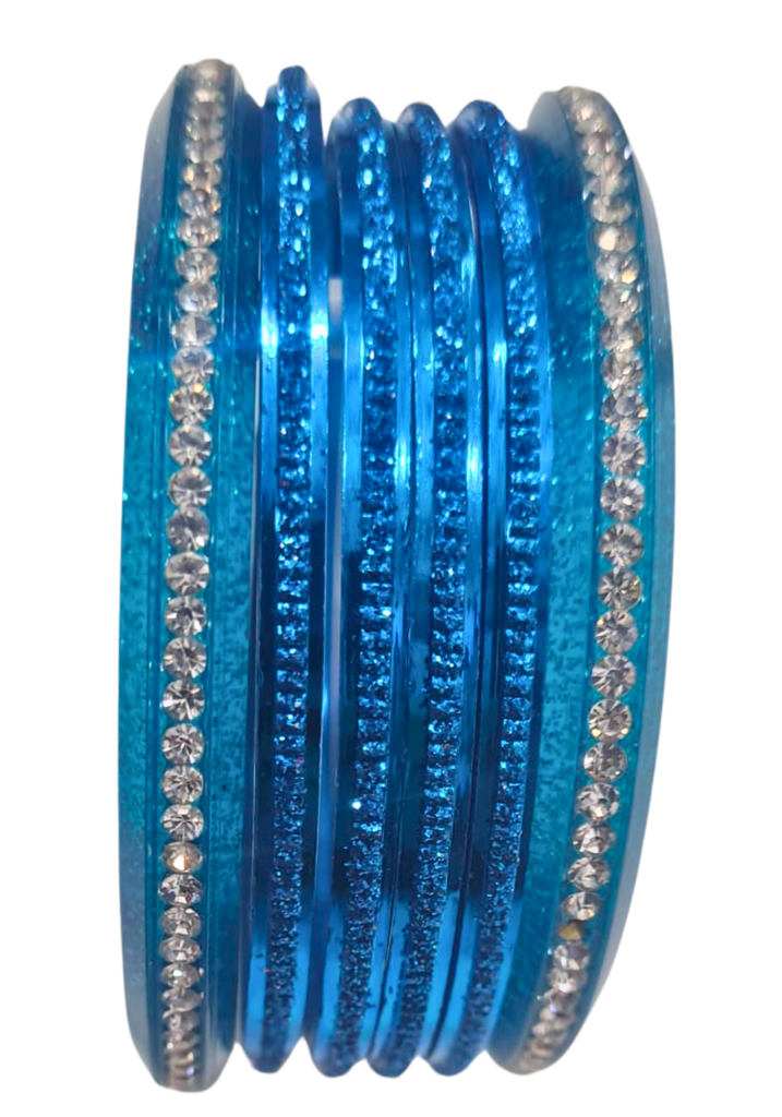 Les bracelets Nirali Bleu séduisent par leur éclat rafraîchissant et leur teinte vibrante. Ce lot de 6 bangles indiens allie paillettes scintillantes et strass argentés pour un effet lumineux et raffiné.