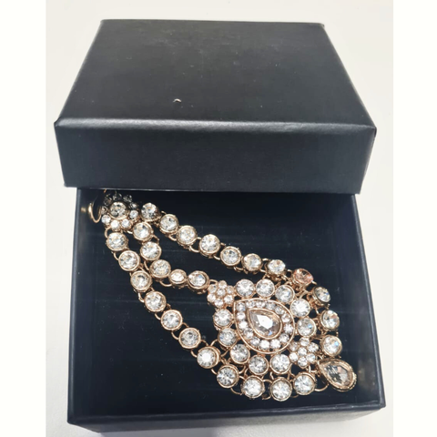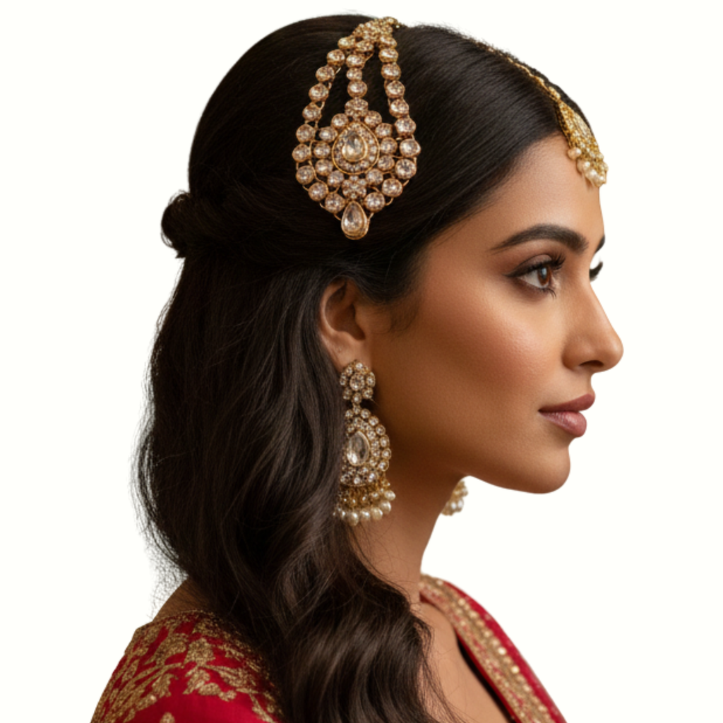Le Jhoomar doré Samia avec ses grosses pierres blanches est un accessoire luxueux qui illumine instantanément votre tenue. Parfait pour les occasions spéciales, il rehausse votre look avec une touche dorée élégante et raffinée