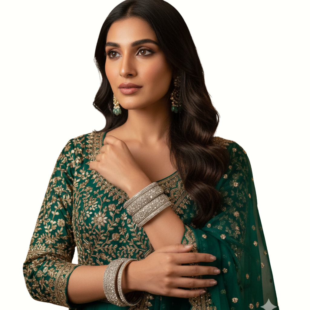 Idéal pour un mariage, une cérémonie ou une soirée, ce set de bracelets argentés s’accorde aussi bien avec un sari, un lehenga, une robe ou un ensemble moderne. Élégance et brillance garanties à petit prix.