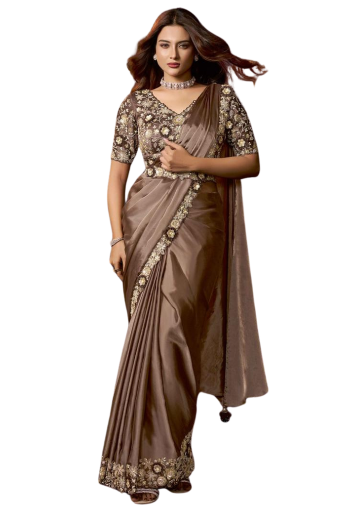 Le Sari Divisha charme par sa teinte cappuccino élégante rehaussée de broderies florales en sequins, pierres et appliques faites main. Son tissu en soie douce assure un tombé fluide et luxueux, tandis que son bustier en soie sauvage brodé apporte une allure sophistiquée et structurée. L’ensemble se distingue par sa ceinture ornée qui souligne la taille et sublime le drapé — une tenue idéale pour les mariages, soirées et fêtes d’exception.