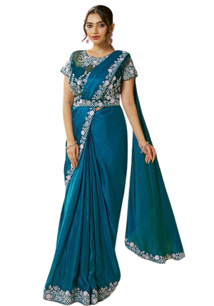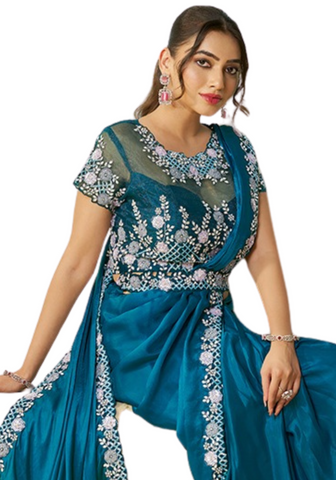 Éblouissant et chic, le sari Neelam en soie satin bleu est enrichi de broderies en pierres et sequins. Moderne et pratique, il séduit par son bustier brodé et ses plis cousus.