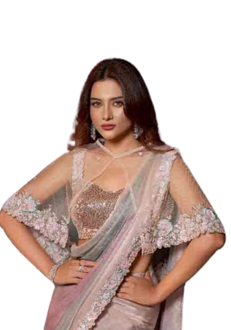 Le sari Nirosha séduit par son dégradé de teintes pastel rosé–mauve–bleuté, associé à un bustier richement brodé et une cape transparente raffinée. Un ensemble luxueux, idéal pour mariages, réceptions, fêtes et grandes cérémonies.