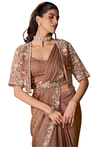 Le Sari Nivedha sublime la féminité avec sa teinte caramel rosé chic et ses broderies étincelantes en sequins, perles et pierres travaillées à la main. Son tissu en soie satin premium assure un tombé fluide et luxueux, tandis que son bustier cousu et sa veste courte brodée apportent une allure moderne et distinguée. Un choix idéal pour mariages, réceptions, soirées haut de gamme et cérémonies festives.