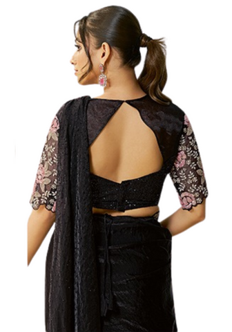 légant et intemporel, le sari noir Ishita se distingue par ses broderies florales rose poudré qui illuminent le contraste du satin noir. Moderne et déjà drapé, ce sari est fourni avec un bustier brodé raffiné, jupon et ceinture assortie.