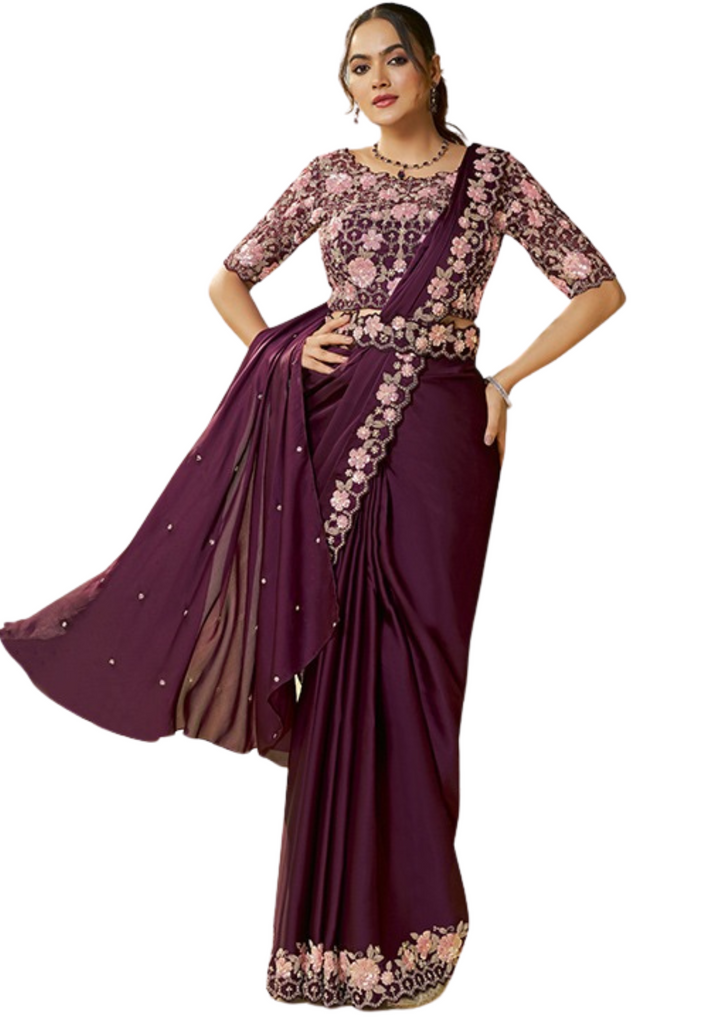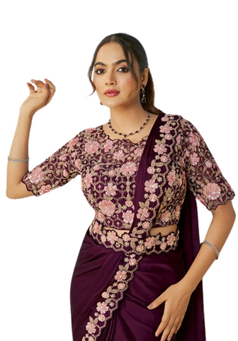 Sombre et élégant, le sari Pranvi en soie satin prune royal est magnifié par des broderies en pierres et sequins. Avec son bustier cousu et ses plis fixés, il incarne un parfait équilibre entre modernité et tradition.
