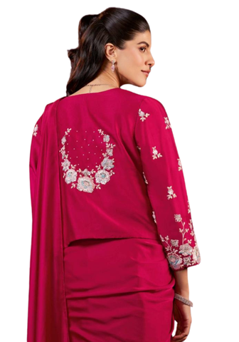 Le Sari Raniyah sublime le regard avec son rose fuchsia intense associé à des broderies luxueuses en sequins, perles et pierres façonnées à la main. Fabriqué en soie satin premium, il offre un tombé fluide et une allure élégante. Son bustier cousu, sa ceinture brodée et sa veste assortie apportent une silhouette moderne, structurée et ultra chic.