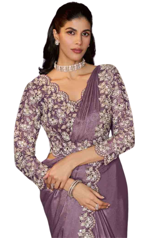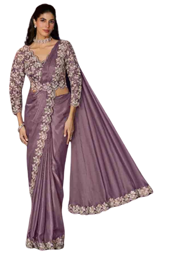 Le Sari Yalina séduit par sa teinte mauve profond et son travail de broderies luxueuses en sequins et pierres éclatantes. Son bustier richement brodé en soie organza apporte une allure distinguée et élégante, tandis que la ceinture assortie structure la silhouette. Une tenue idéale pour mariages, fêtes, soirées et cérémonies.