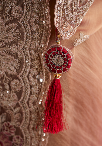 Broderies : Fils dorés, sequins scintillants, motifs floraux fins et détaillés, bordures entièrement brodées et pompons artisanaux