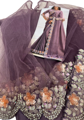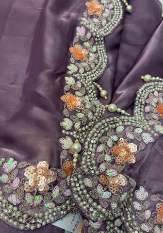 Élégance et raffinement s’unissent avec le Sari Afreen, une tenue d’exception en soie satin au tombé fluide et luxueux. Chaque détail est minutieusement travaillé :