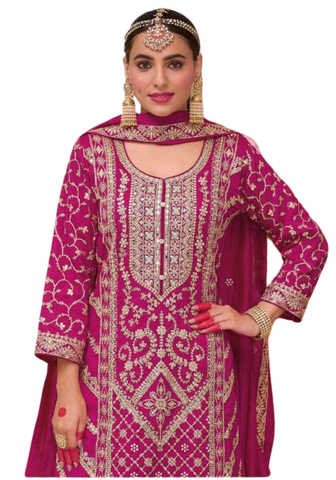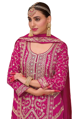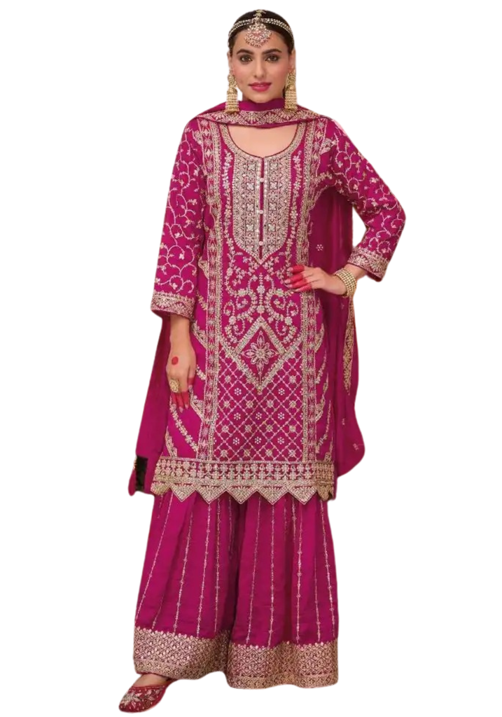 Ensemble Meher fuchsia en soie brodée, élégant et lumineux pour réception ou mariage indien moderne. L’ensemble Meher Fuchsia Royal combine féminité et modernité. Sa teinte vibrante sublime toutes les carnations et attire le regard lors des grandes occasions.