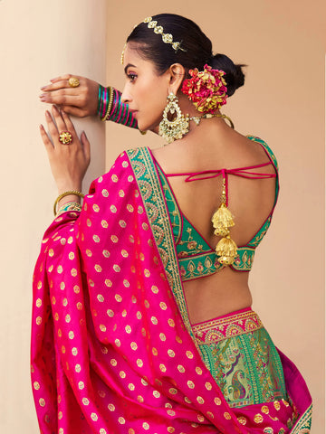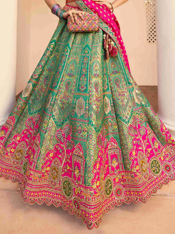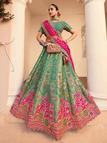 Le Lehenga Ranjitha est une pièce d’exception en soie Banarasi, parfaite pour une mariée ou une proche. La jupe et le bustier vert sont sublimés par de délicates broderies et de somptueux motifs floraux inspirés de l’art indien traditionnel. Le châle rose magenta à bordure verte ajoute un contraste éclatant et raffiné. De pompons décoratifs assortis viennent sublimer la jupe, ajoutant une note festive et raffinée. Une ceinture assortie vient souligner la taille avec élégance.