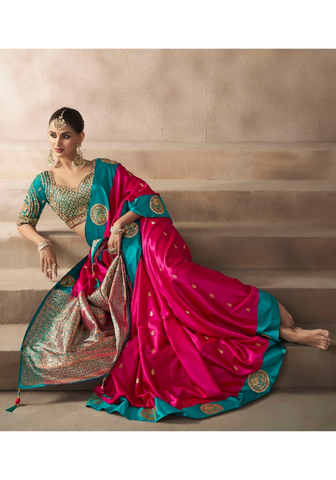 Le sari Ishani en soie satin combine la vivacité du rose fuchsia à l’élégance du bleu-vert. Sa bordure finement brodée et son bustier en soie sauvage richement travaillé en font une tenue éclatante pour mariage, fiançailles ou réception.