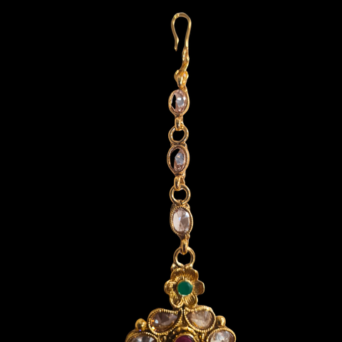 Découvrez le Tikka doré "Anita" ! Orné de pierres polki blanches, vertes et roses, ainsi que d'une perle élégante, ce bijou sophistiqué ajoute une touche de couleur et de raffinement à vos tenues traditionnelles. Parfait pour un look chic et intemporel.