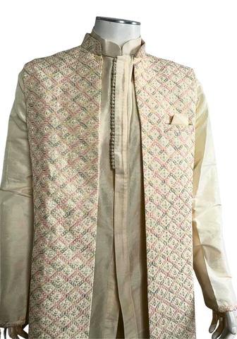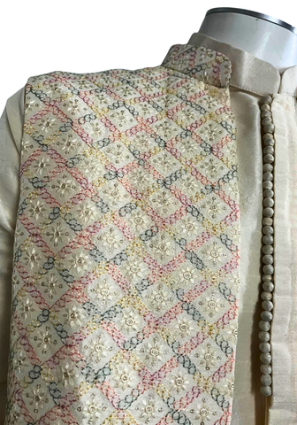 Le sherwani Raghav séduit par son élégance douce et raffinée. Un ensemble 3 pièces en soie mixte, sublimé par une sur-veste brodée aux nuances pastel, idéal pour les mariages et cérémonies élégantes