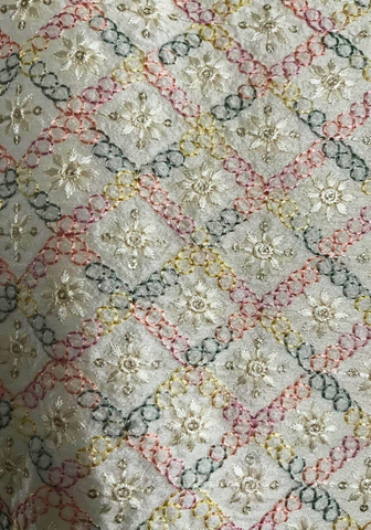 - Broderies pastel : rose poudré, vert sauge, beige doré