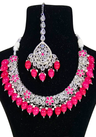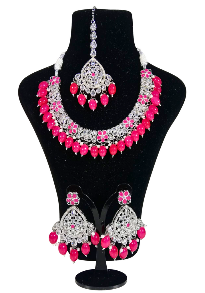 Cette incroyable parure Indienne est composé d'un collier, une paire de boucles et un bijoux de front tikka. Le collier est incrusté avec les pierres polkis ainsi que les perles roses, les boucles et le bijou de front sont assorties avec le collier. Ce ravissant collier épouse parfaitement votre cou, un joli cadeau pour vous-même ou un être cher. Assortissez votre tenue rose ou argenté avec cette magnifique parure raffinée et chic.