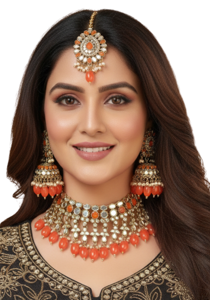 Éblouissez vos invités avec la parure Sharleen orange, un ensemble 3 pièces comprenant un somptueux collier, un maangtikka (bijou de tête) raffiné, et des boucles d’oreilles jhumkas assorties. Chaque pièce est ornée de miroirs éclatants, de perles délicates et de pierres brillantes, conférant à cette parure une allure festive et élégante.