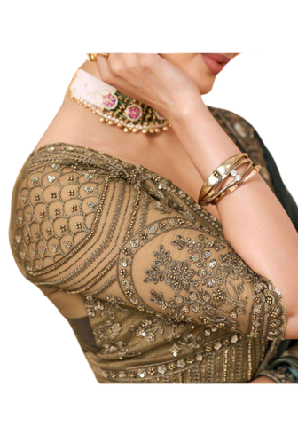 Le sari Nikita mêle des nuances vert bronze à une bordure brodée précieuse pour une allure sophistiquée et chaleureuse.