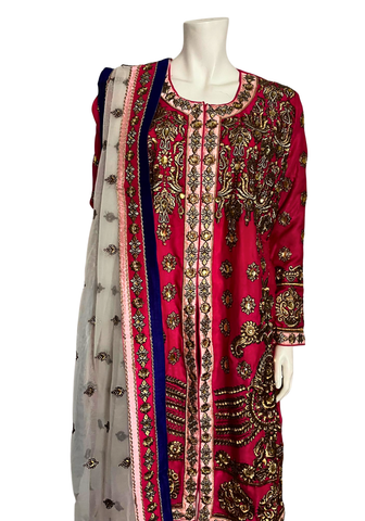Number of pieces: 4, i.e. the long jacket, the skirt, the trousers and the shawl