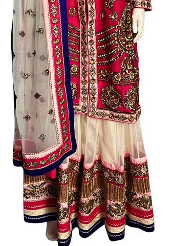 Exclusive off-white and pink colored lehenga, it is richly embroidered with sequins, stones, zaris and multi. The tunic is designed in the shape of a jacket with long sleeves. It is a 2 in 1 outfit, both the skirt set (lehenga) and the pants set (salwar kameez). You can wear it in 2 versions for 2 different occasions, this outfit gives you a different look, very elegant and feminine. The shawl is also fully worked with buttis and edging. You will be sublime and very chic with this trendy and royal style lehenga or salwar.