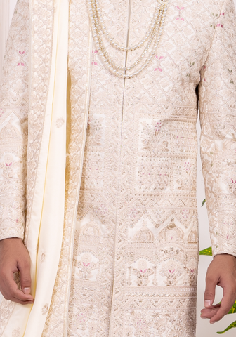 Laissez-vous séduire par l’élégance majestueuse du Sherwani homme Jehangir, une création raffinée inspirée des tenues royales indiennes. Ce sherwani de mariage ivoire doré, orné de motifs architecturaux délicatement brodés et de perles scintillantes, reflète un savoir-faire artisanal d’exception. Son tissu luxueux, ses nuances douces et sa coupe droite soulignent la prestance du marié avec une allure noble et intemporelle.