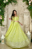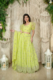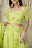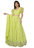 Live your fairy tale by wearing this beautiful Prema lehenga, this outfit is a meticulously designed work of art by a designer embellished by embroidery with sequins and threads and decorated by a pretty pompom. At a wedding or a dinner or other evenings, this Indian dress is perfect as a guest or a bride. This outfit is composed of a pretty flared lehenga in bottle green, a white bustier with a shawl in beige color accompanied by a matching belt. Be the fashionista by wearing this beautiful lehenga, both chic and trendy!