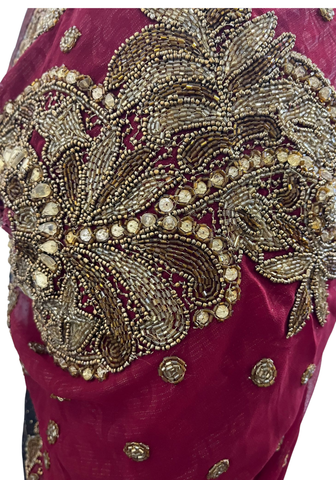 Get classic & modern with this look from the Raniya collection. The sari in chiffon with woven borders in gold and colors as well as a pearl border; stones and cutwork. This saree gives a chic and traditional look, which is the charm of this saree. You have the choice of the bustier either in black and matching the material of the sari.
