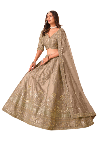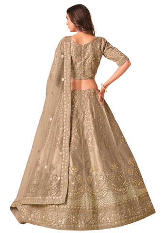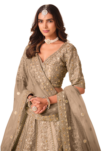 Le lehenga Maythili taupe doré offre une élégance subtile et sophistiquée, idéale pour les cérémonies haut de gamme.