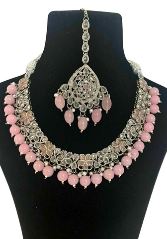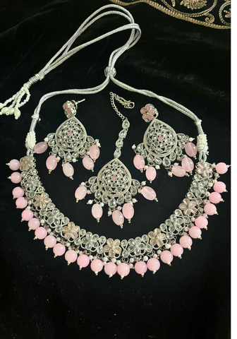 Cette parure Indienne est composé d'un collier, une paire de boucles et un bijoux de front tikka. Le collier est incrusté avec les pierres polkis ainsi que les perles roses, les boucles et le bijou de front sont assorties avec le collier. Ce ravissant collier épouse parfaitement votre cou, un joli cadeau pour vous-même ou un être cher. Assortissez votre tenue rose ou argenté avec cette magnifique parure raffinée et chic.