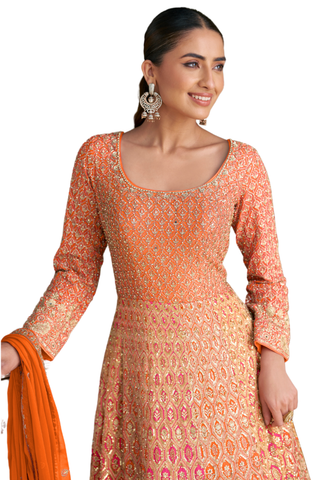 La robe Liyana est une pièce lumineuse au dégradé rose et orange, sublimée par de riches broderies traditionnelles. Idéale pour mariage et cérémonie. La Robe Liyana séduit par son dégradé éclatant rose fuchsia et orange aux motifs brodés raffinés. Son haut ajusté met en valeur la silhouette tandis que la jupe longue évasée apporte fluidité et élégance. Les broderies dorées traditionnelles rappellent le savoir-faire indien et captent subtilement la lumière.