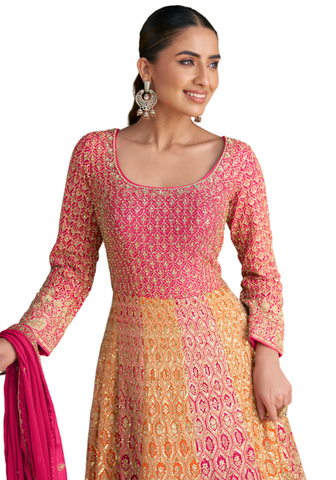 La robe Nour est une pièce lumineuse au dégradé rose et doré, sublimée par de riches broderies traditionnelles. Idéale pour mariage et cérémonie. La Robe Nour séduit par son dégradé éclatant rose fuchsia et doré aux motifs brodés raffinés. Son haut ajusté met en valeur la silhouette tandis que la jupe longue évasée apporte fluidité et élégance. Les broderies dorées traditionnelles rappellent le savoir-faire indien et captent subtilement la lumière.